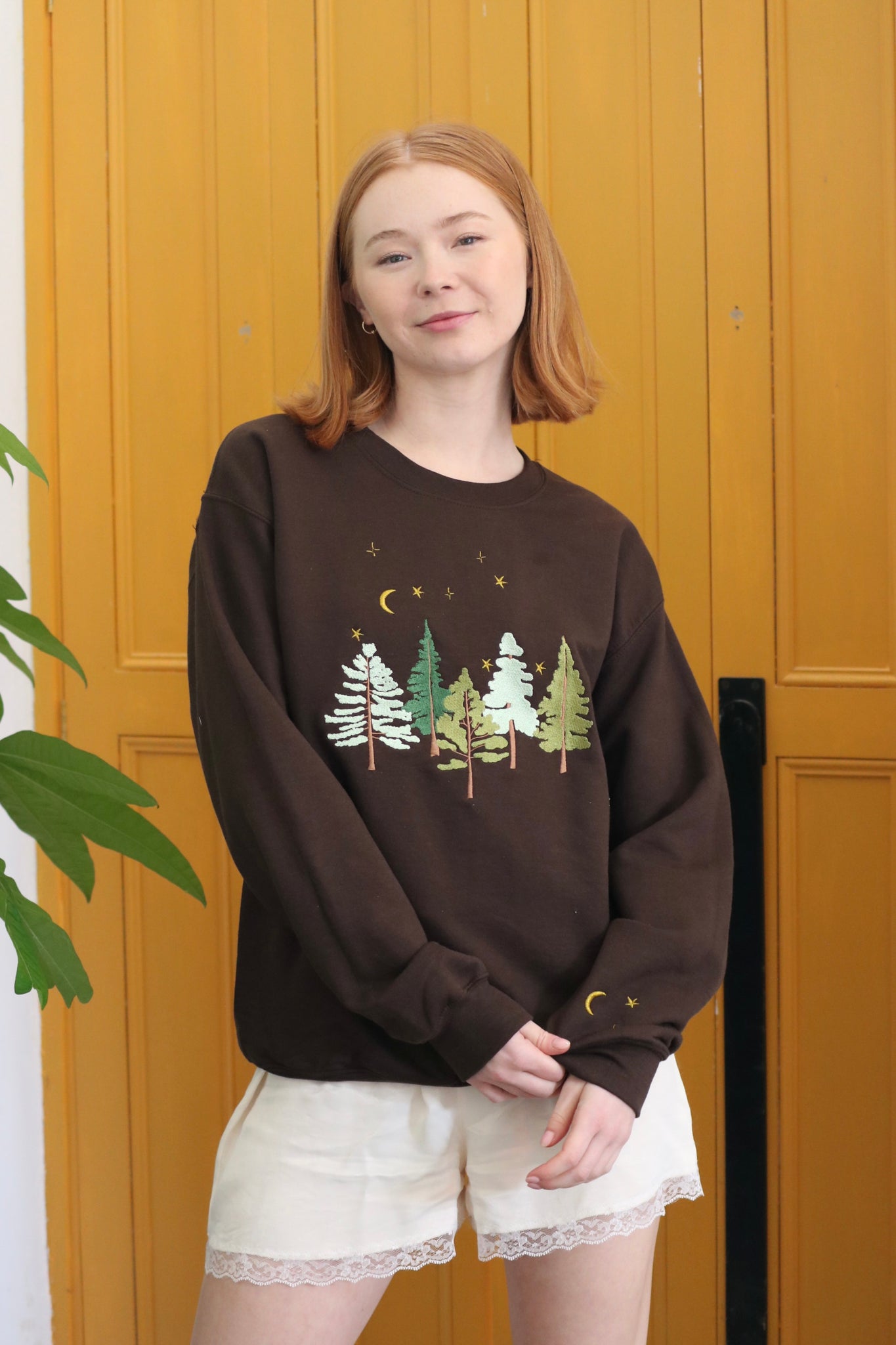 Mystical woodland trees at night - kinda spooky but cute. This design features 5 embroidered trees and metallic star and moon sleeve