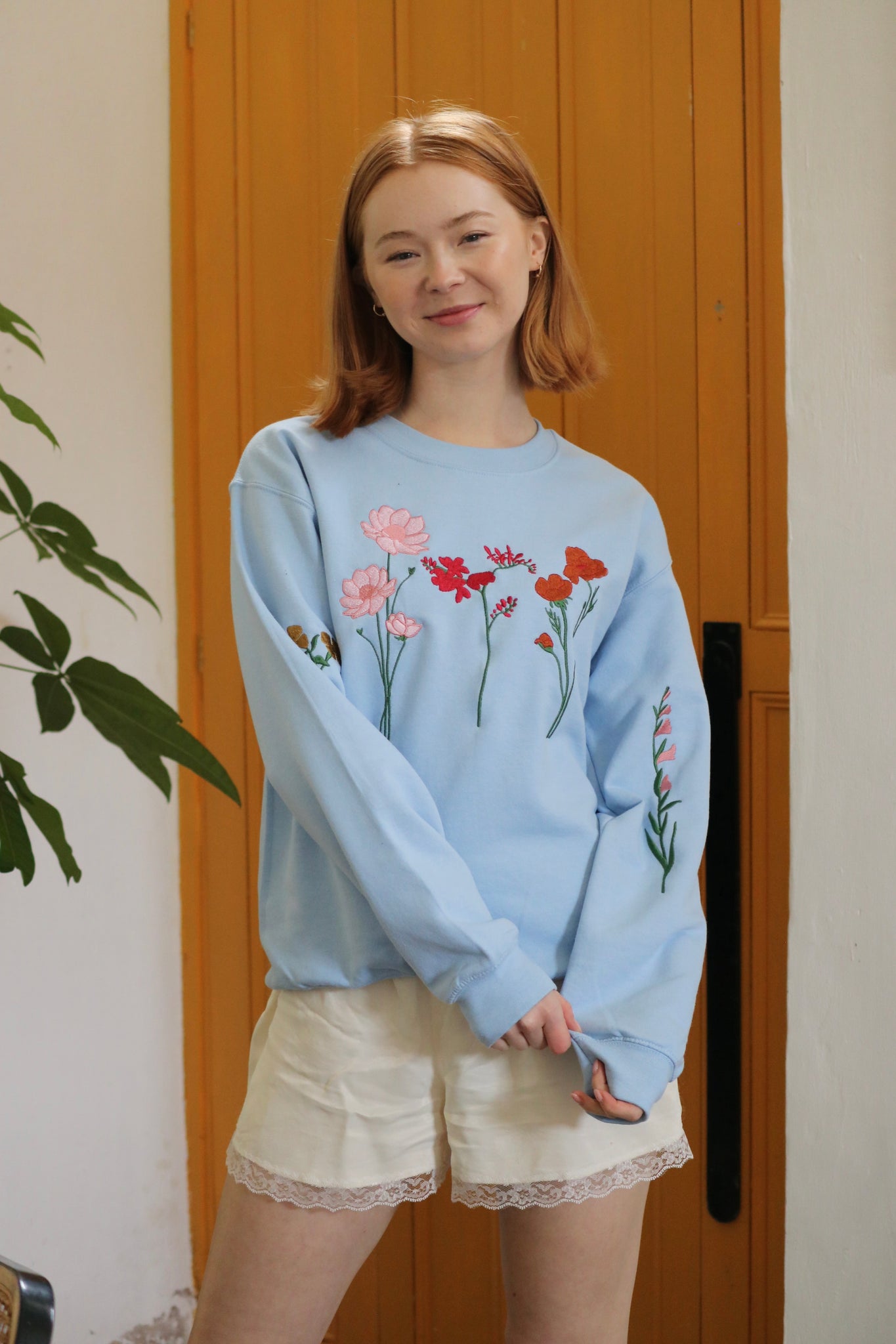 Emmas hand drawn doodles translated into stitch, featuring 5 autumnal flowers on the front along with floral sleeves in rich bronze, burgundy, gold and pink colours.