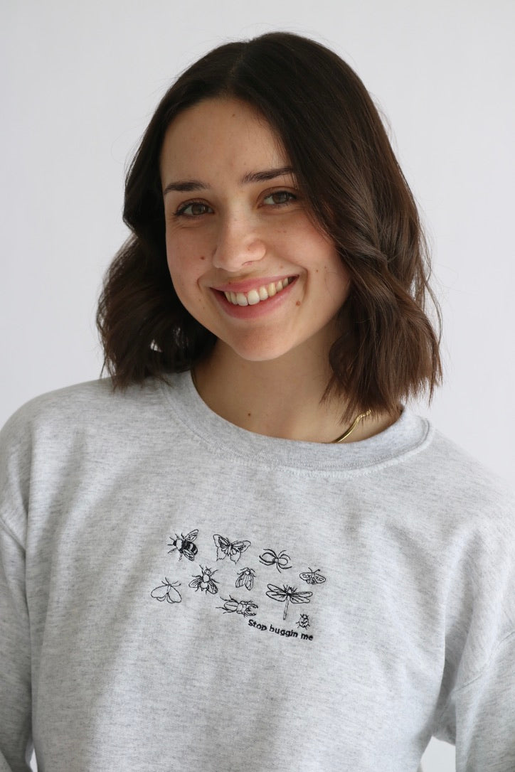 Stop buggin me embroidered slogan sweater with lots of bugs design!