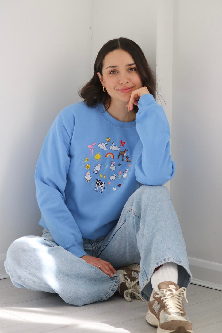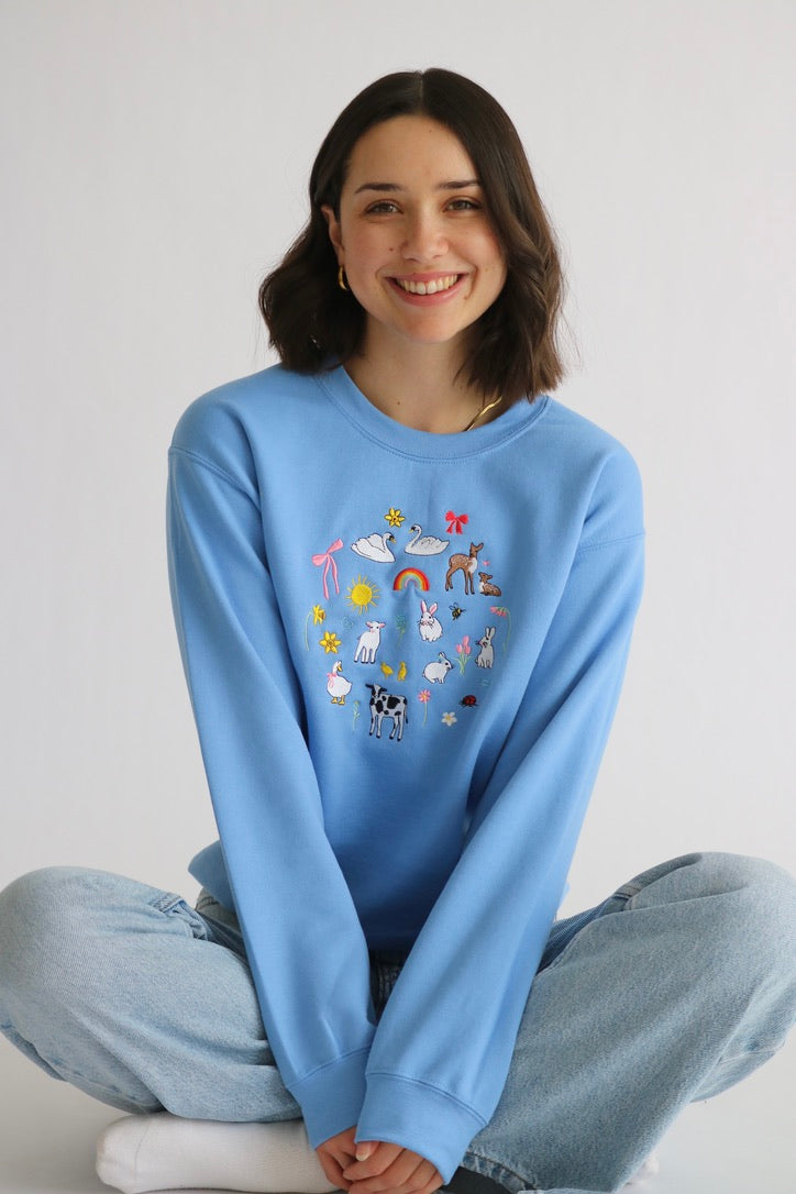 Embroidered mini spring / Easter design featuring swans, cute bunny rabbits, rainbow, spring florals and lot's of other super cute embroidery!