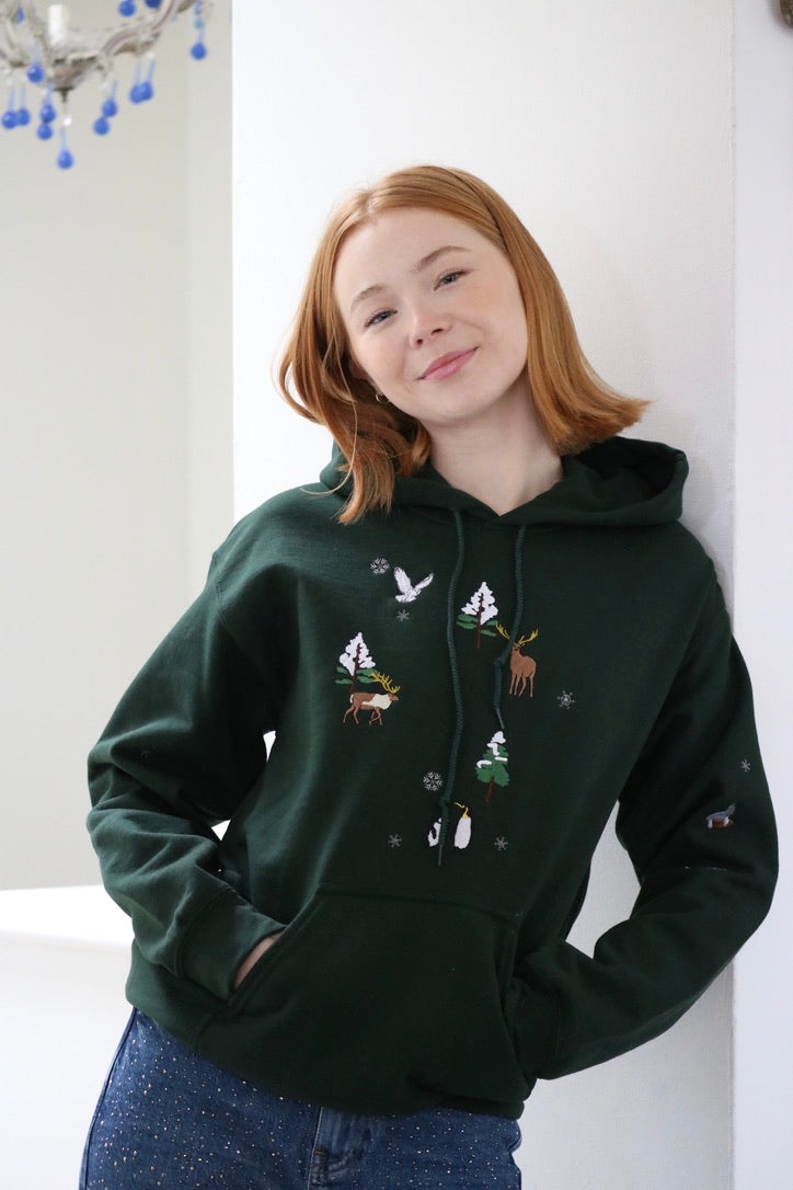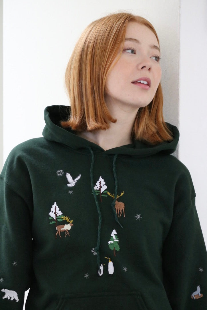 Warm up in this cosy sweater featuring tiny little embroidered Artic Animals - snowy owl, penguin and reindeer on the front plus some super cute sleeves!